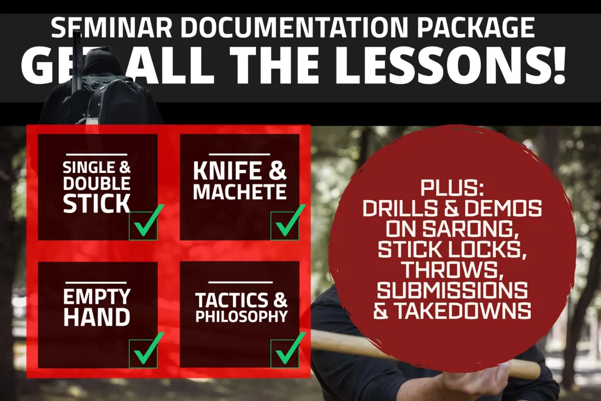 Lessons on Knife, Stick, Machete, Empty-hand, Sarong and more!